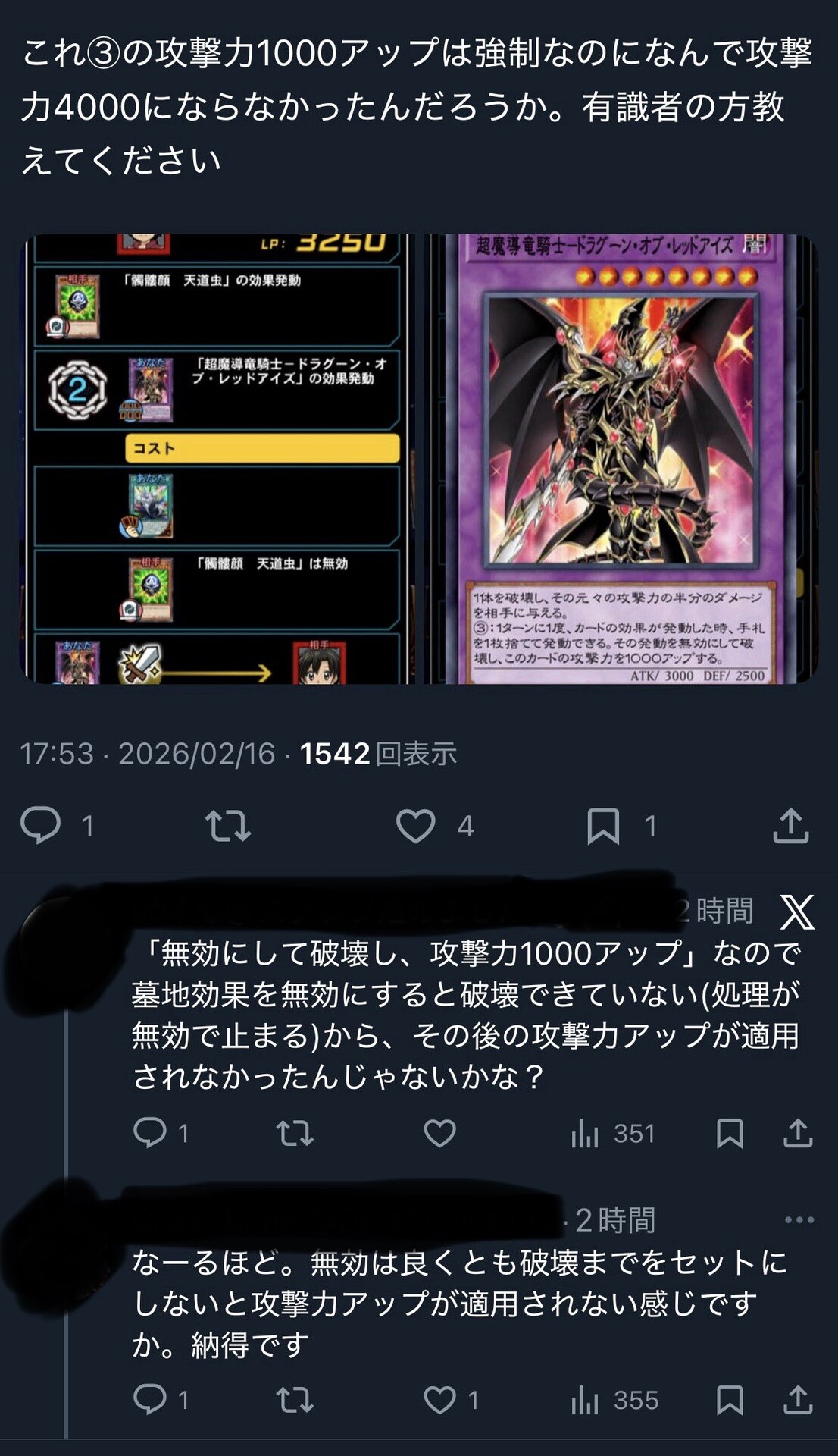 ▽1つの効果に複数の処理がある場合、前から順番に適用されるけど、ドラグーンの無効効果の場合、無効→破壊→攻撃力アップだけど無効は出来ても破壊できなかった場合その後の攻撃力アップが適用されなくなる